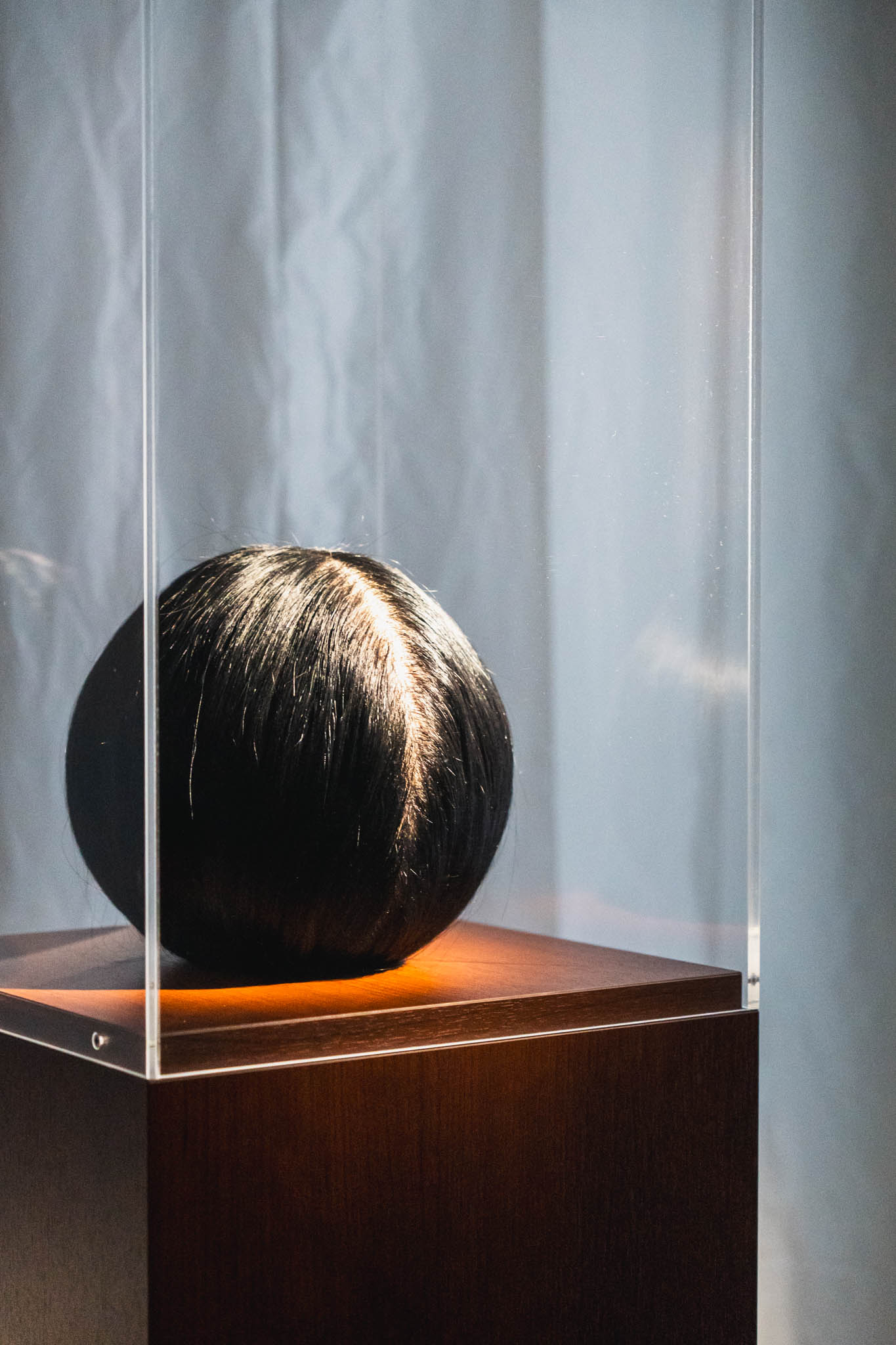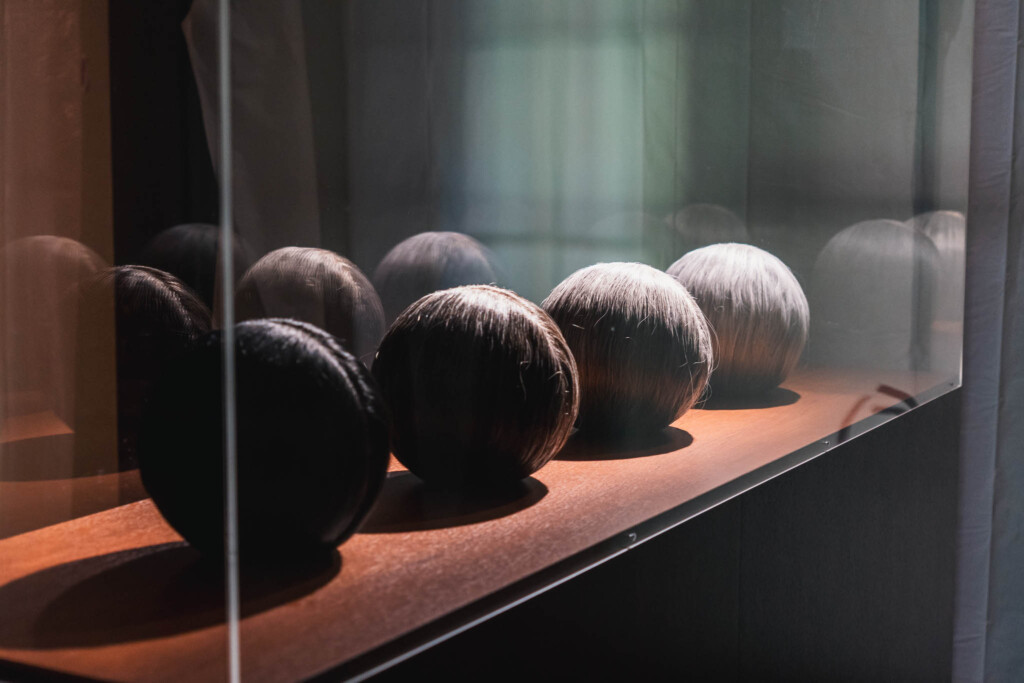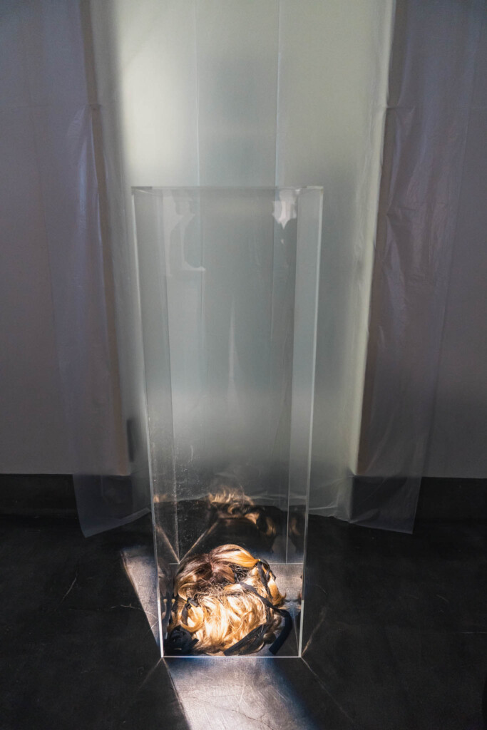 身体は不在。けれど、身体の最も親密な痕跡である髪は、ガラスケースに陳列されている。これは「人間の標本」のようでもあり、「形見」のようでもあり、「未完成の彫像」のようでもある。