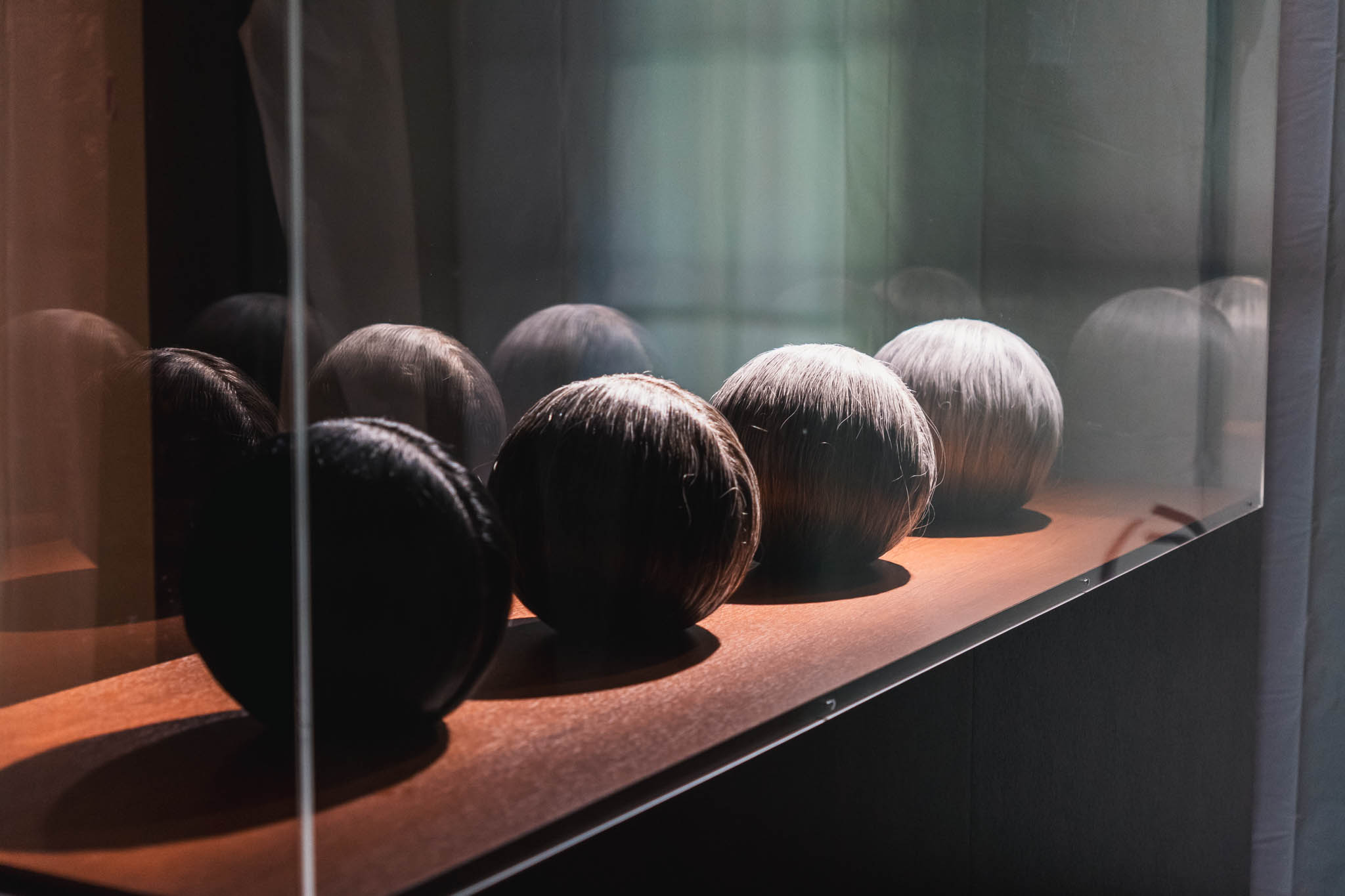同じ会場には、ガラスケースに収められた赤い毛髪で覆われた頭部のオブジェもあり、別の部屋には5色の異なる毛髪で覆われた頭部が整然と並んでいました。これらは「人生の5つのステージによる髪色」を並べたものとされています。