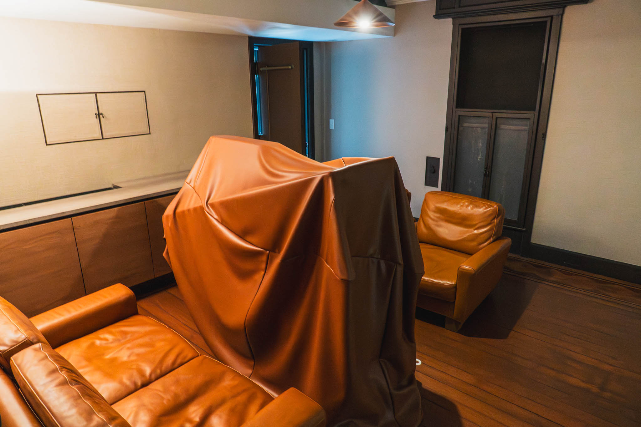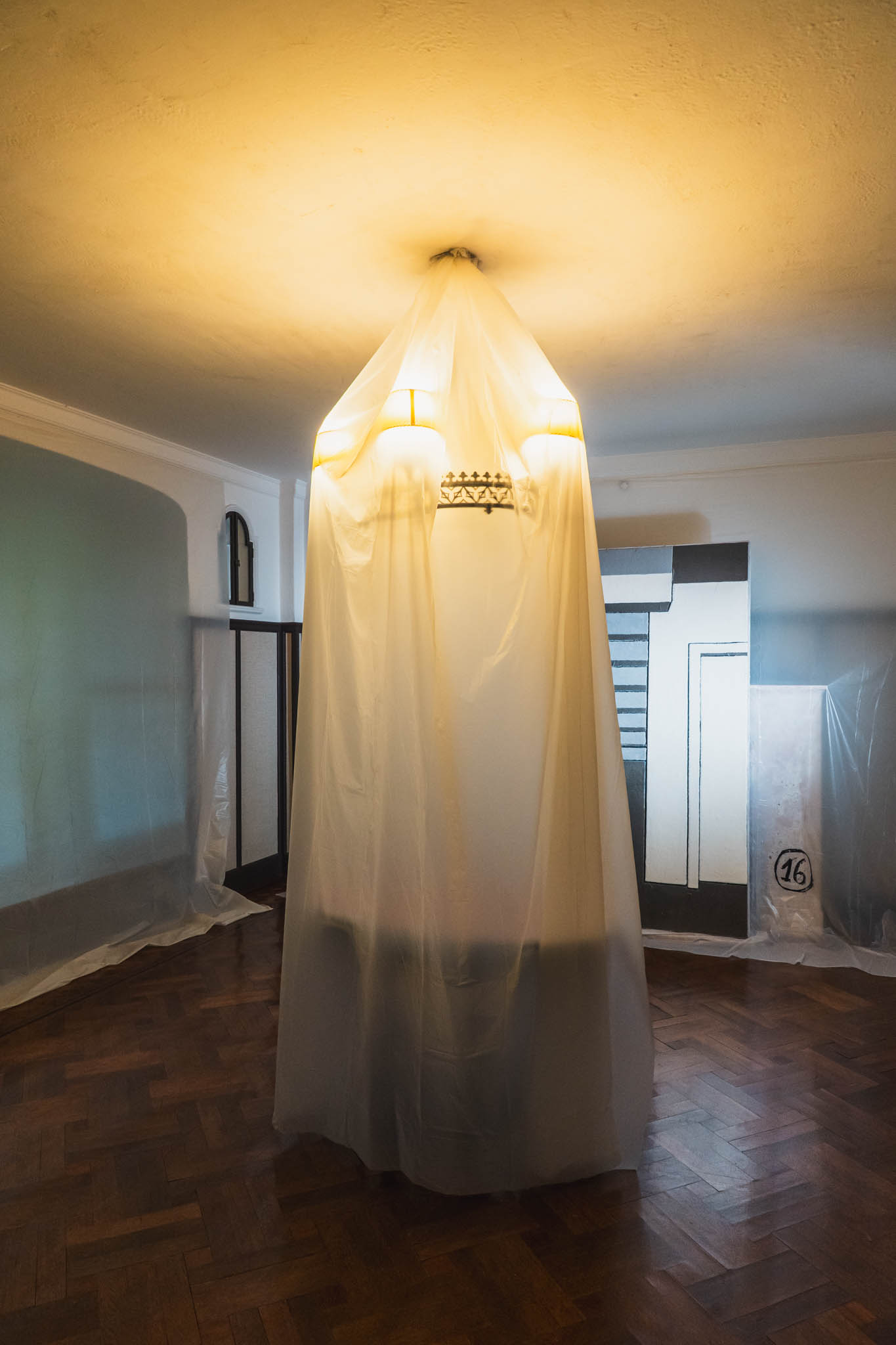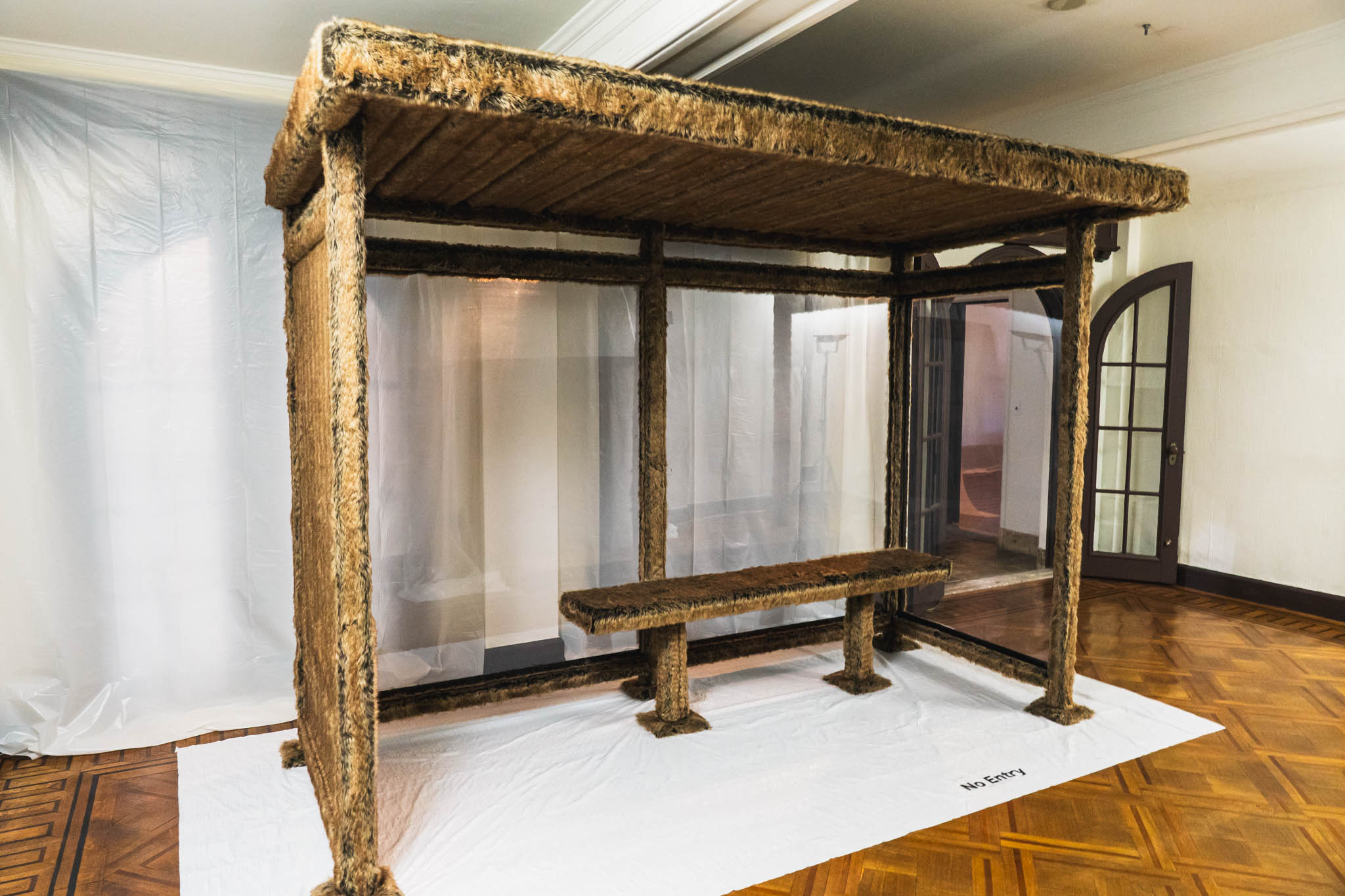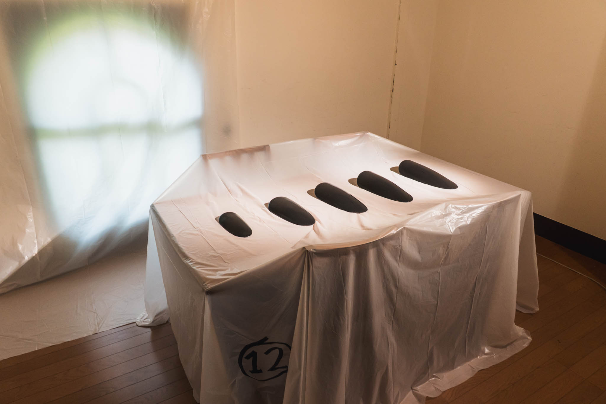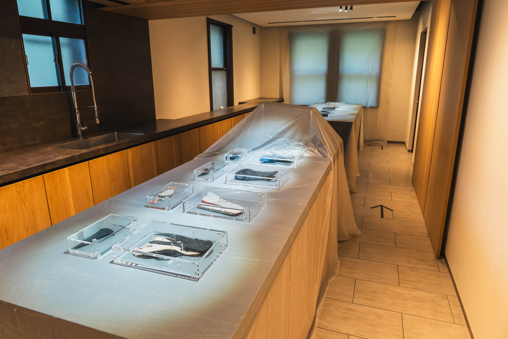 エントランスからすでに違和感。床も窓もビニールカバーで覆われた空間