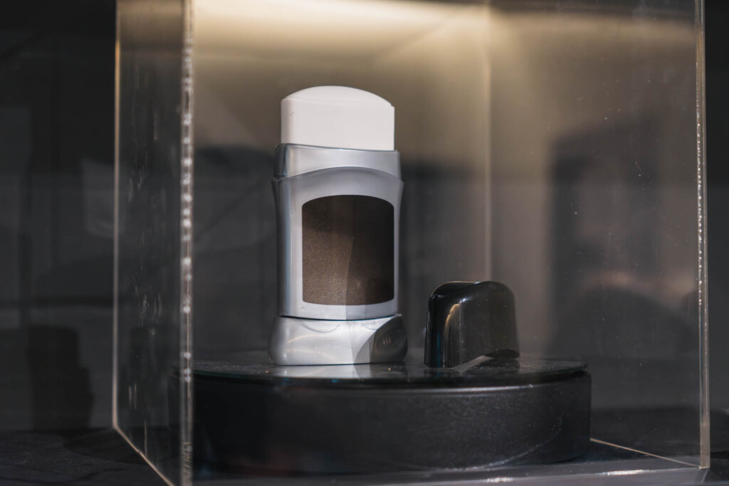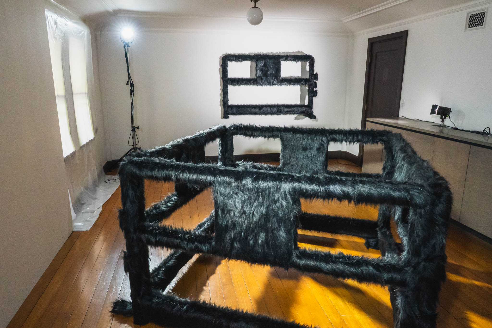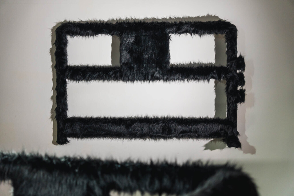 機能的な硬さと、ファーの柔らかさ。守ることと隠すこと。秩序と動物性。相反するイメージが一つのオブジェに同居していて、見ているうちに「これは一体、何を遮断しようとしているのだろう」という問いが浮かんできます。