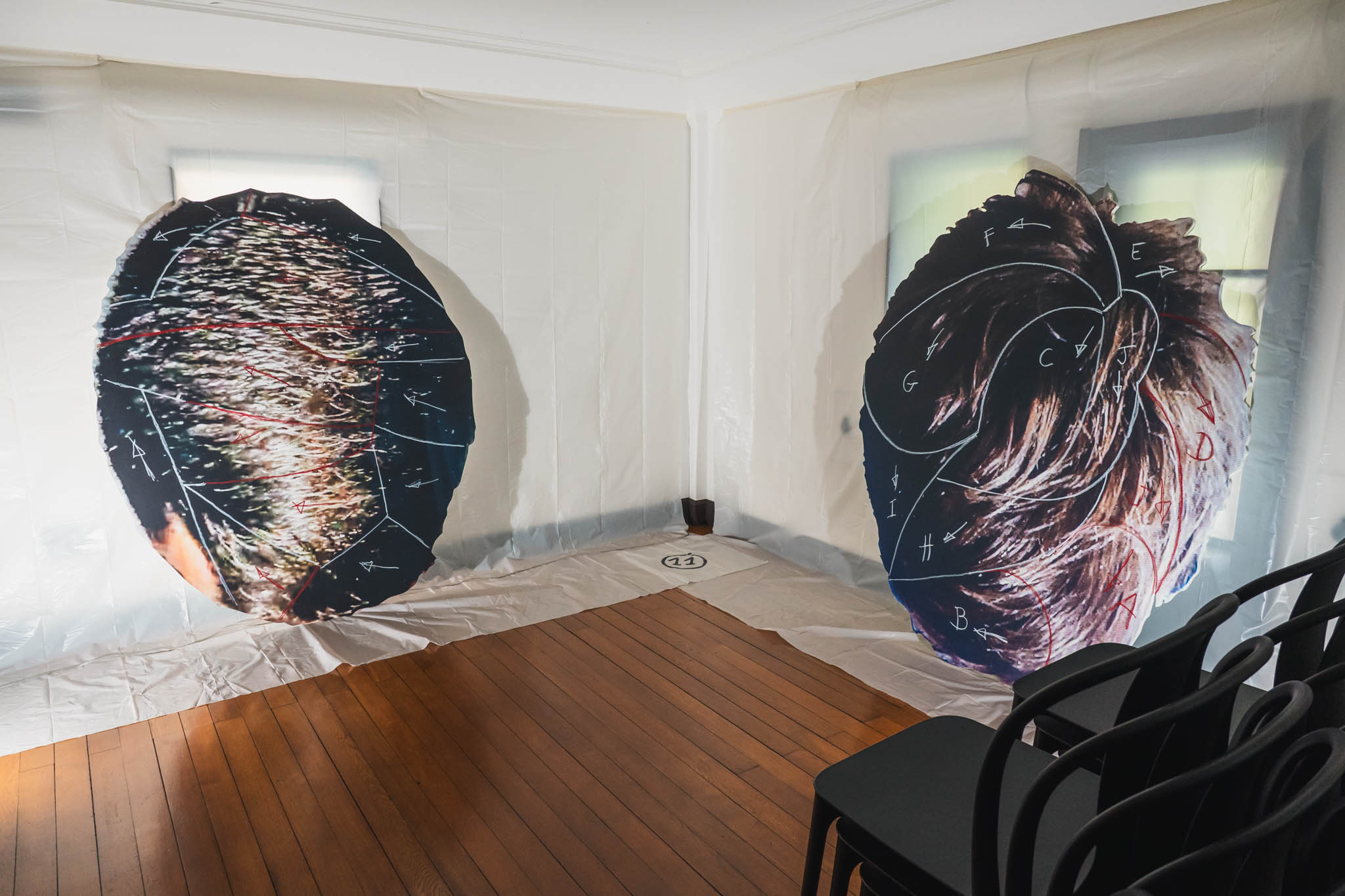 ビニールに覆われた邸宅という視覚的な重さ。髪の毛のオブジェが醸し出す身体の不在感。映像作品の不穏さ。これらが積み重なって、来場者は「何か理解できない、けれど確かに迫ってくる」感覚に包まれます。